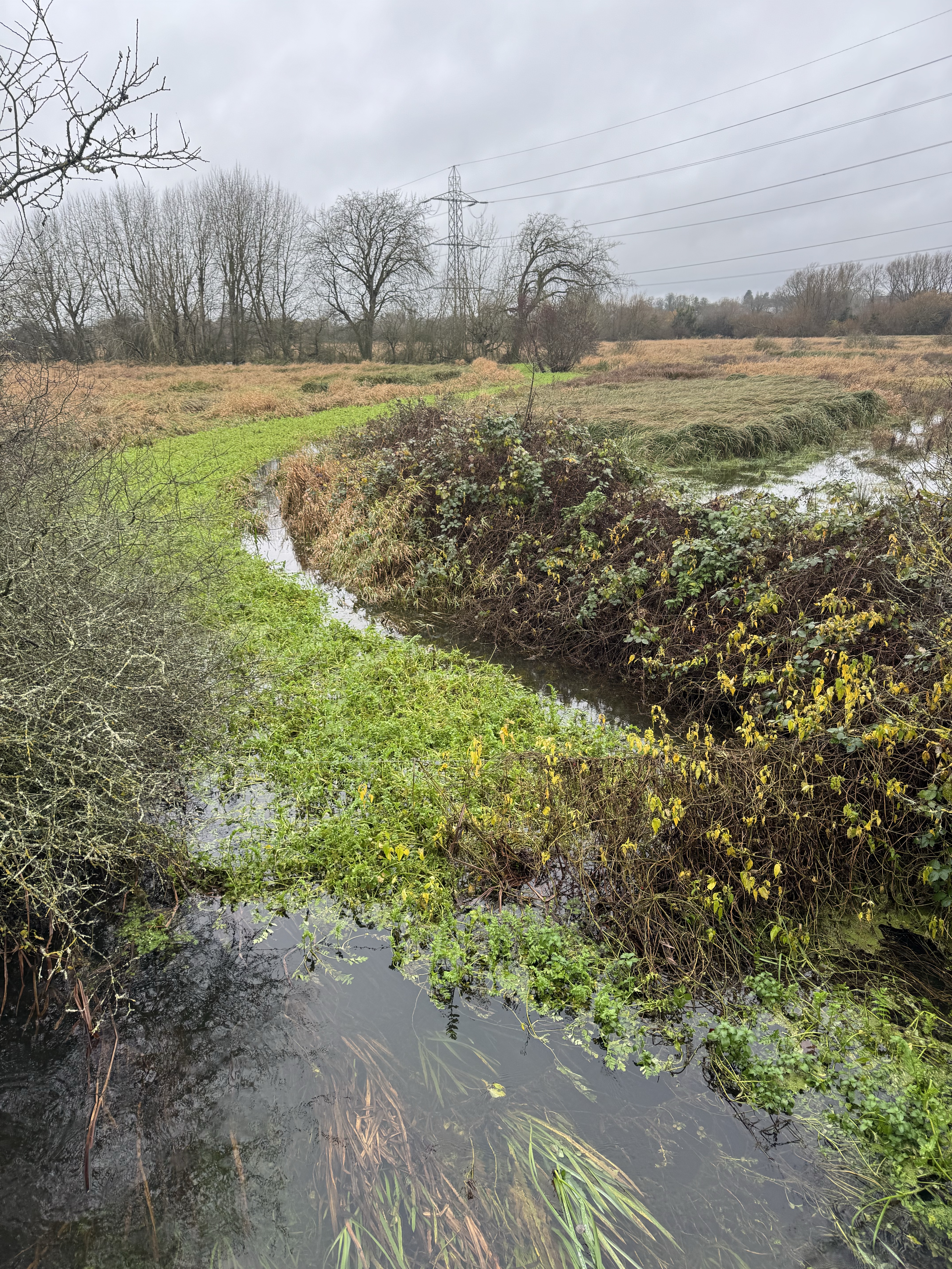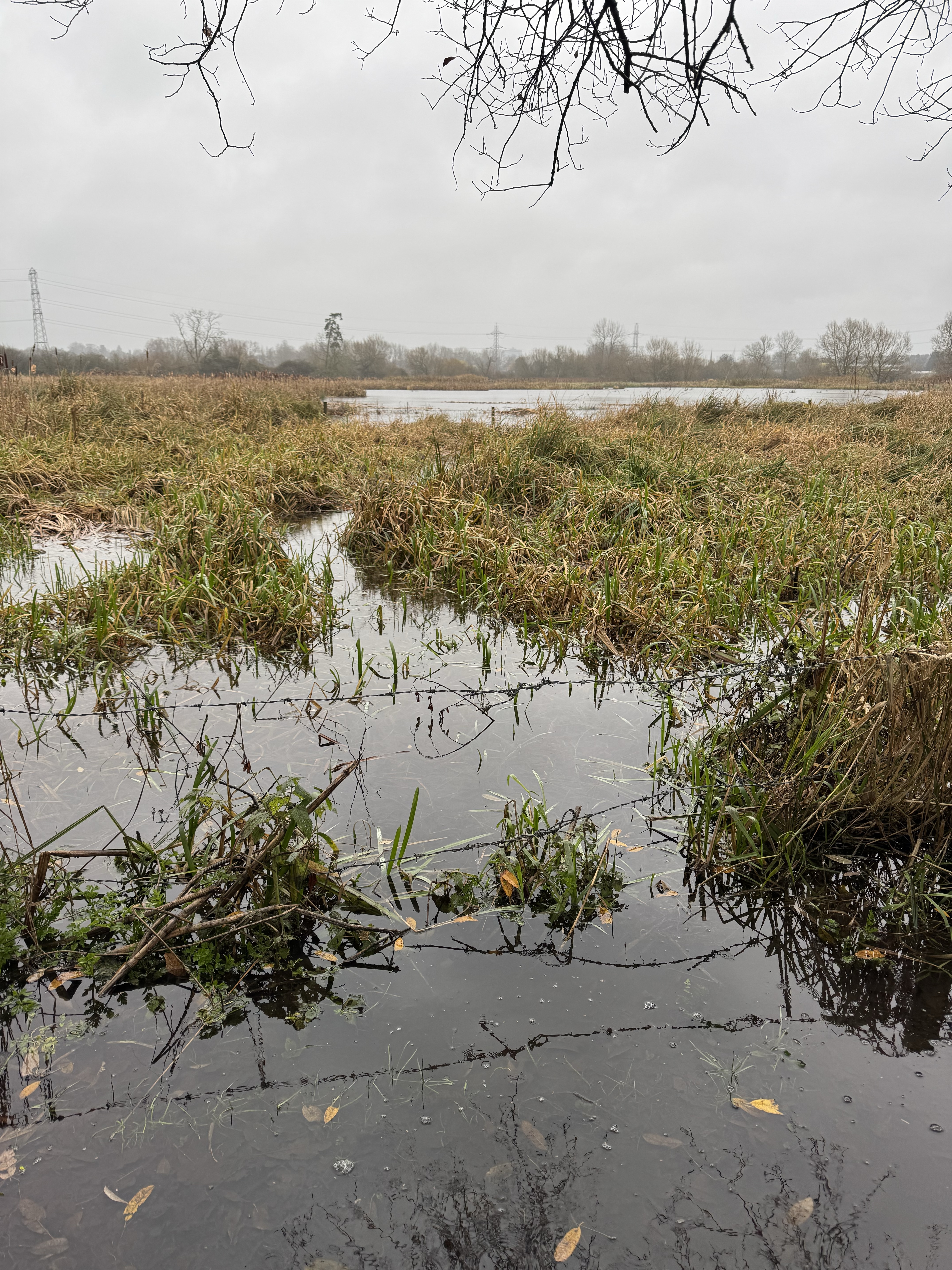 During 22nd and 23rd November 2024 Storm Bert brought catastrophic flooding and damage to huge areas of the UK. Within hours the water levels in the Kennet Thames and Holy brook started rising. The Kennet meadows just upstream of Reading started to flood and by Monday the footpaths were impassable even in wellies. Towards the end of the week the levels started dropping and I was able to walk over a large area without getting my feet wet. The water reached the very top of my wellies in many places. It was quite a little adventure. I made a lot of observations about how the water was flowing. I took a lot of photos too.