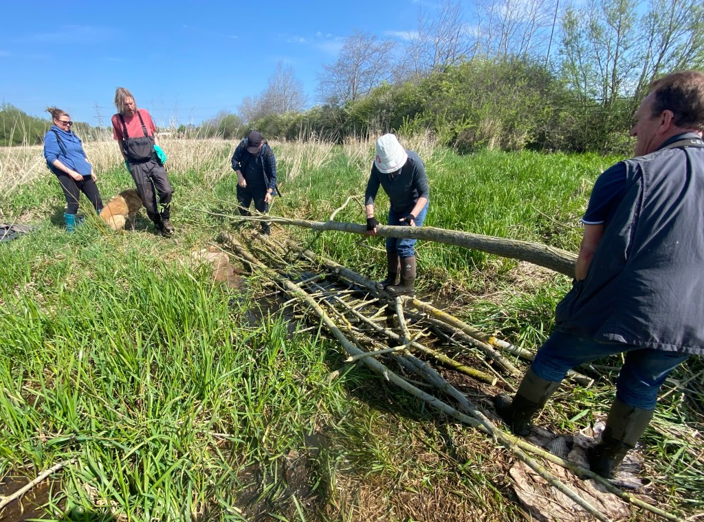 In April, we met up as a group over Easter weekend, to continue our mission to improve and nurture the urban wilderness of Fobney Marsh. As we did in March, we planted willow trees and stomped our new path. This time, we – and the temptation to indulge in more poetic metaphors here is strong – built a bridge. A bridge to allow our path to continue its way north through the meadow towards the town.
