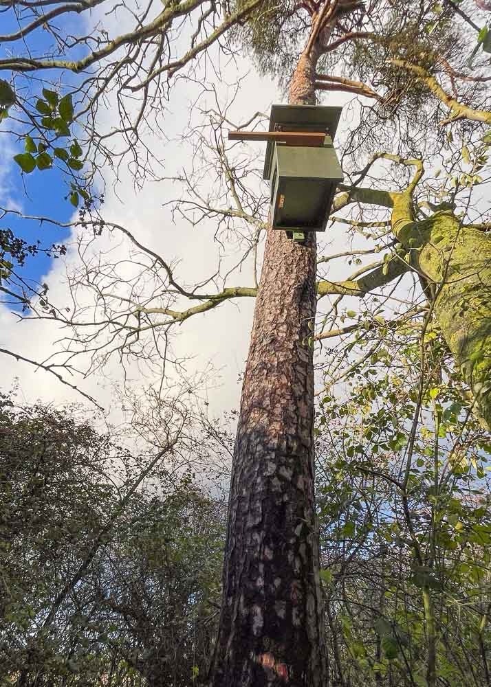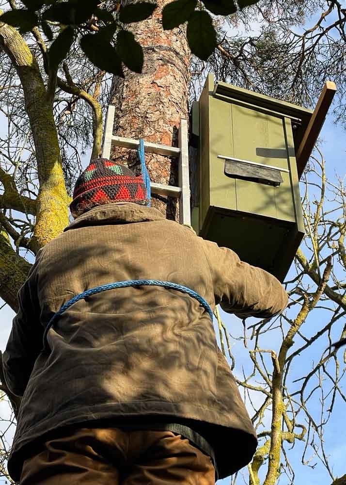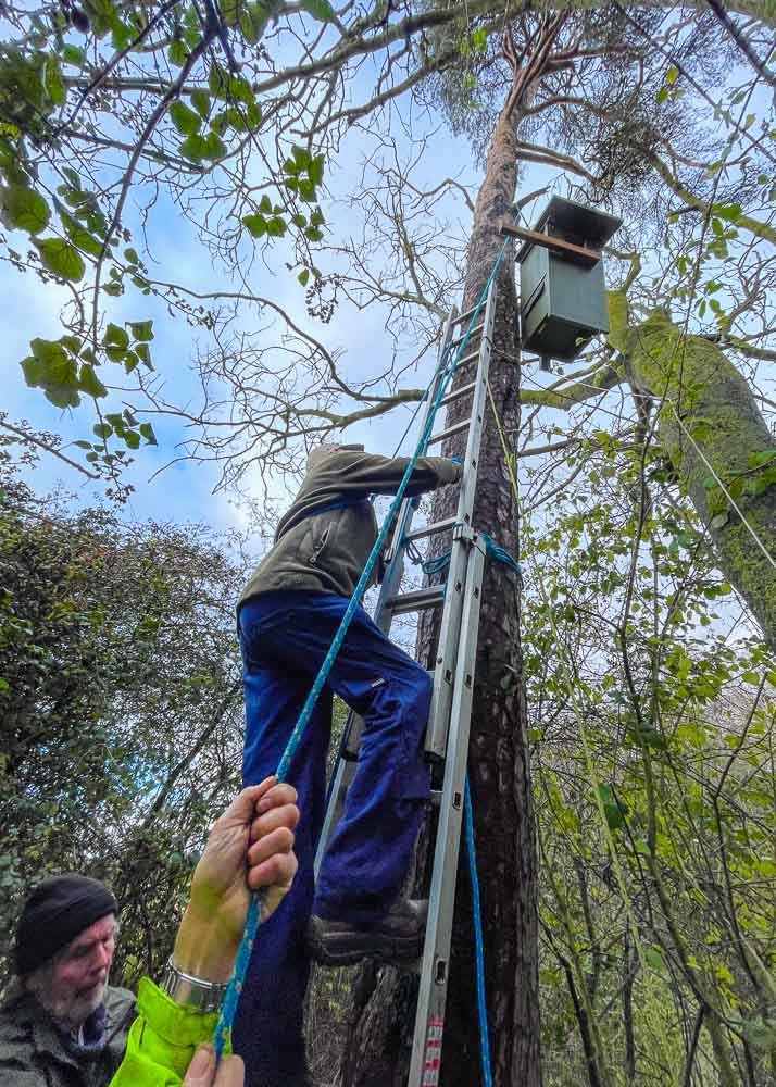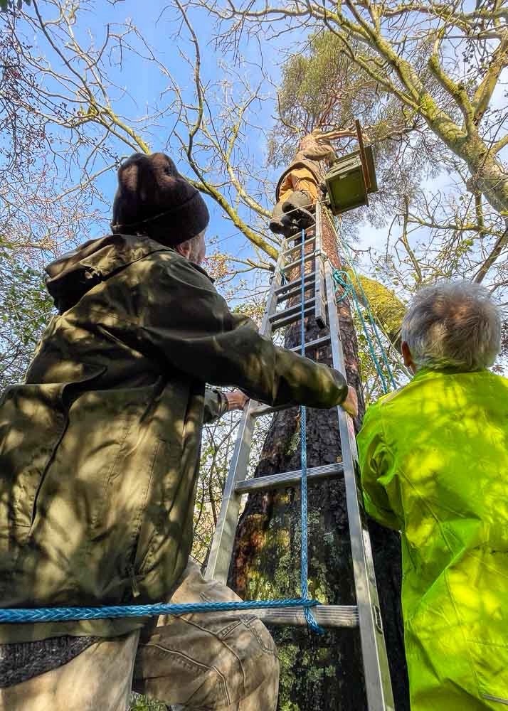 We all hoisted Owl’s new home to the top of the tree… nearly.