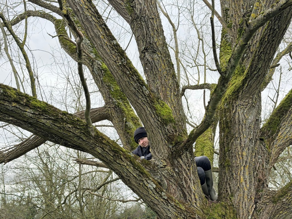 So we clambered up into the branches and cut a branch off, and then cut it into little pieces. Careful with that axe, Eugene.