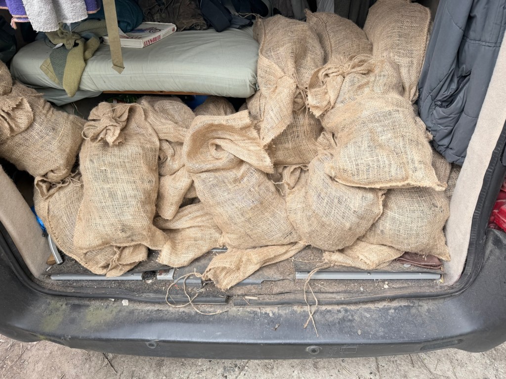 So we filled some more sacks with clay. 50 of them. We then loaded them into a van.
