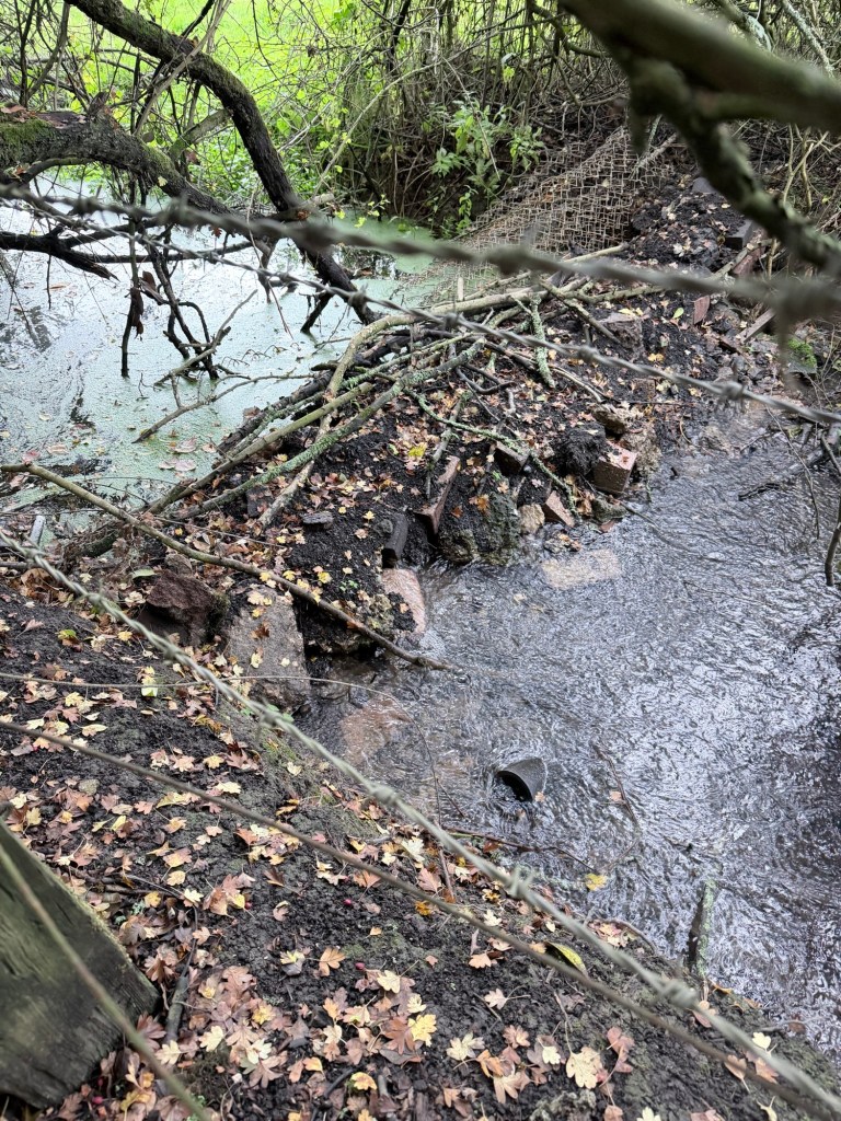 This dam is holding back water too, and hopefully with a bit of weed and mud and dead leaves the flow will reduce. It’s flowing quite a bit but hopefully it will get blocked without any help from us. But if it needs it we’ll give it a hand.
