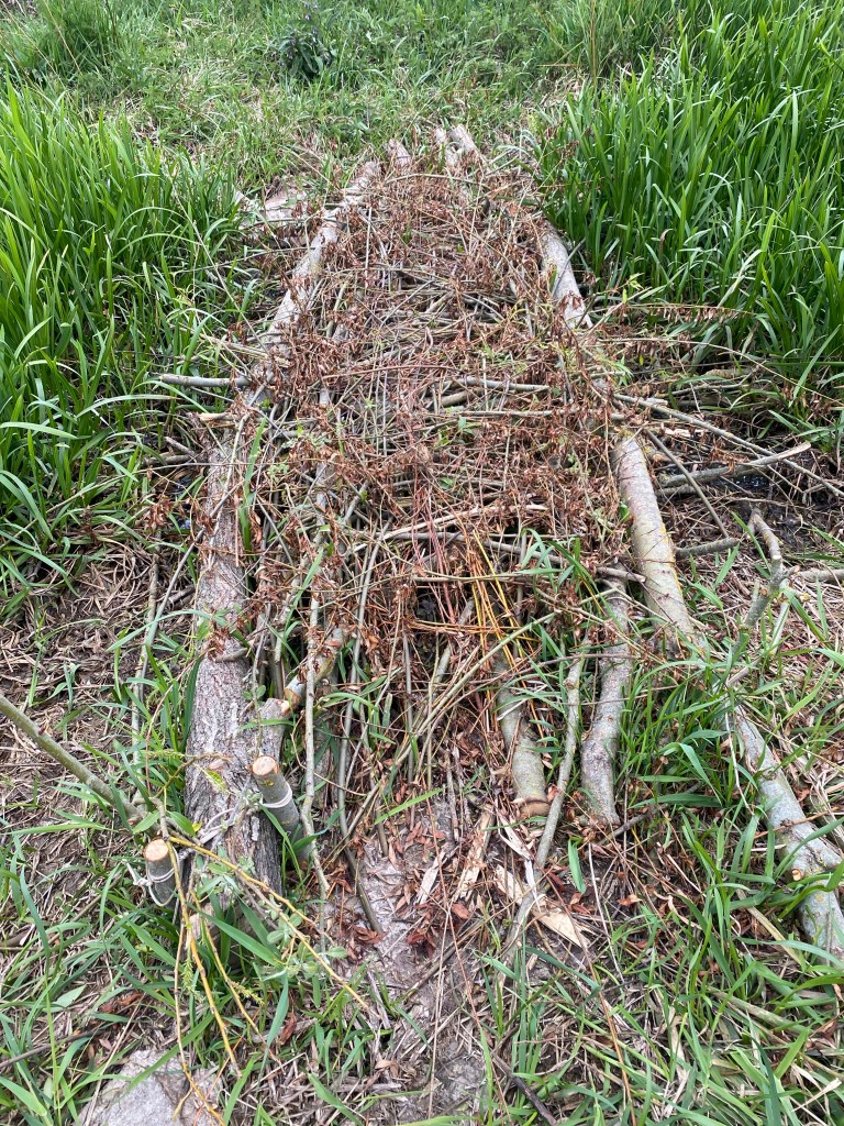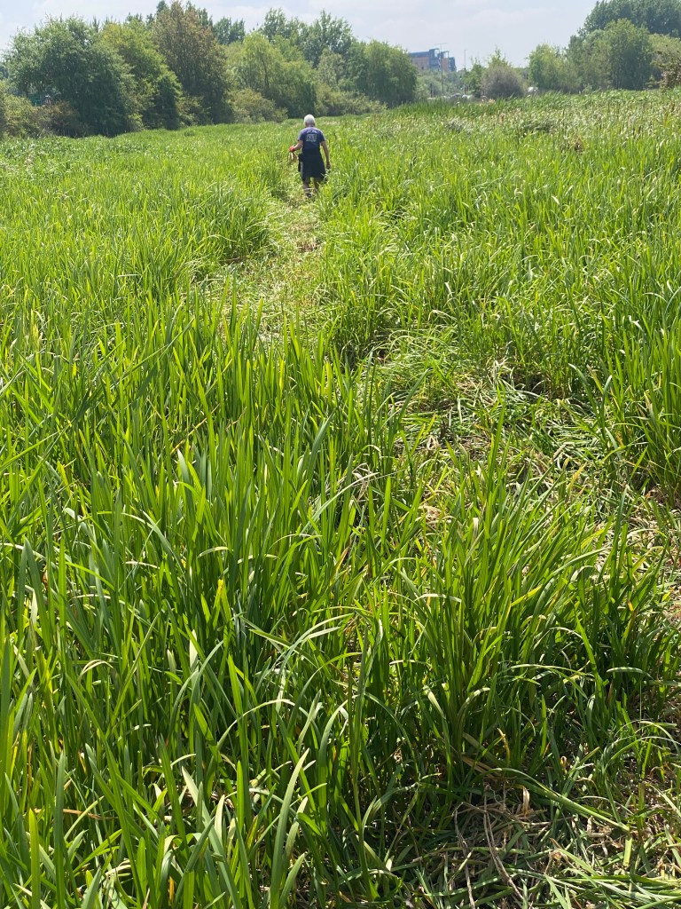We soon arrived at the end. There’s a wide and deep ditch. It can be crossed in wellies but we’d like to be able to cross in shoes you might wear for a summer stroll. So we need another bridge!