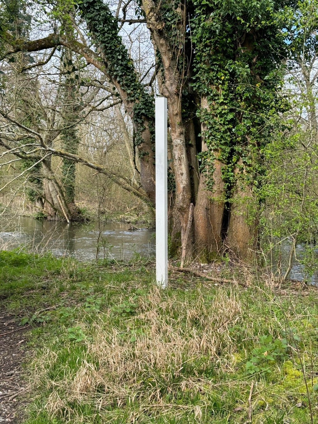 One winter in the pouring rain and with the river a flood it was almost impossible to reach. With nobody likely to be around the metal sign got dismantled and swept away by the river. One of the posts went that way too but one was too stubborn and had to be left.